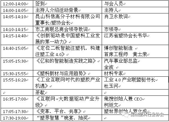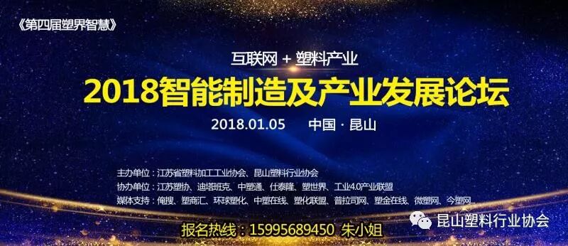 2018年1月5日由昆山塑料行业协会主办,江苏塑协、迪塔班克、中塑在线、仕泰隆、塑世界、工业4.0产业联盟协办,由俺搜、中塑在线、塑商汇、环球塑化、塑化联盟、普拉司网、微塑网、今塑网、塑金在线媒体支持,博创塑机、聚泰机械、塑金在线、昆山欧瑞达单位支持的“第四届塑界智慧之2017智能制造及产业发展论坛会”将于昆山市陆家镇美高美国际酒店举行。据了解,本次大会将以“互联网+塑料产业”为主题,包括整车企业、组装配套、注塑成型、塑料模具、塑料改性、代理商、石化企业、工业设计、智能化配套、塑机辅机、机械配件、检测机构、商会协会……及关联企业负责人参加,共同探讨产业互联网时代的发展与未来。